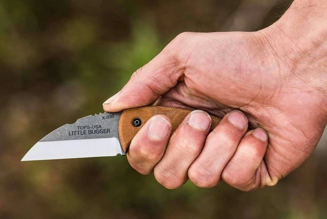 The TOPS Little Bugger offers outstanding TOPS fixed blade performance in a scaled down design. Measuring just under 6 inches, the Little Bugger won’t weigh you down, but still offers enough cutting power for most cutting tasks. It features a curved profile with a scandi ground sheepsfoot blade and a contoured tan canvas micarta handle. Pick up a compact EDC companion with the Little Bugger from TOPS Knives.