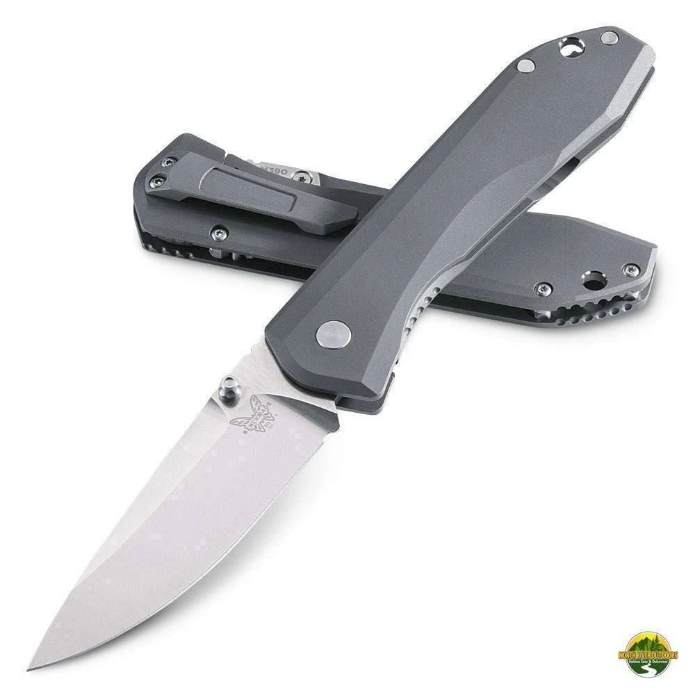 The Benchamde 761 Ti Monolock folder from Benchmade is a fabulous knife. It features a titanium handle and pocket clip with a sandblasted and oiled finish. A premium M390 steel modified utility drop point blade rides on ball bearings for super smooth performance. Open built construction with stainless steel barrel spacers.