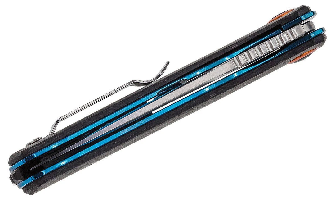 The smooth-running Boker Plus Nebula is a modern pocket knife for everyday use, equipped with pleasantly contoured handle scales made of wild carbon fibre. Blue anodised stainless steel liners and an orange ring around the black blade axle screw set a special colour accent. The satin-finished spearpoint blade in D2 is opened on ball bearings via thumb hole or flipper and reliably locked by a sturdy liner lock. An ergonomic finger recess and jimpings in the area of the thumb rest and on the black spacer made of G10 additionally increase work safety. With lanyard hole, clip (tip-up/r) and high-quality nylon case for storage.