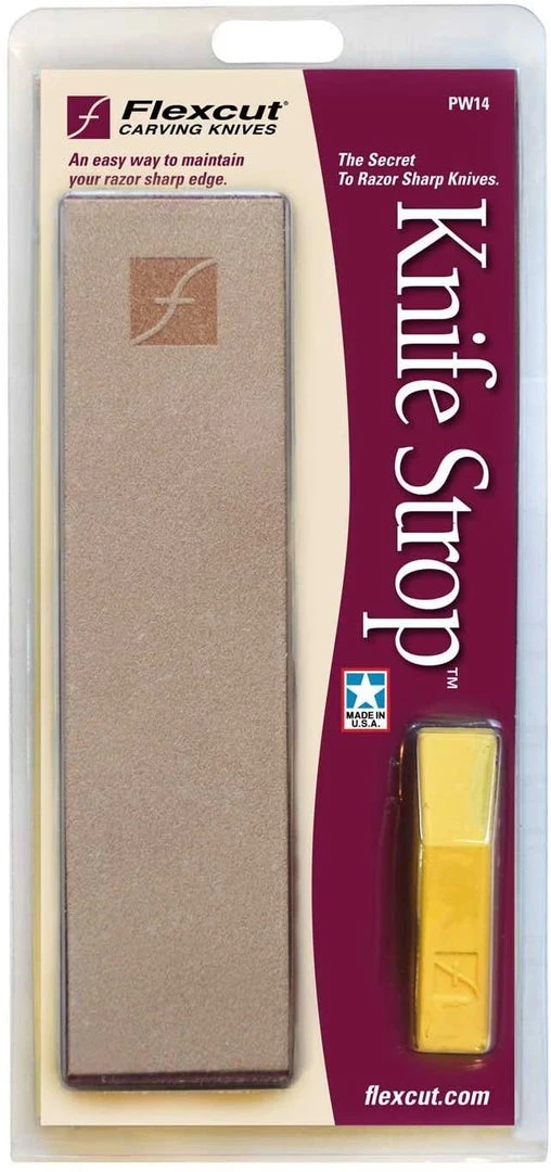 Finally, Flexcut® has a Knife Strop. Now all the Flexcut and other knife users can enjoy the same benefits that palm tool users do with the Flexcut SlipStrop (143657). The Knife Strop comes with Flexcut Gold Polishing Compound™ and is the ideal way to keep your knife blade razor-sharp between touches to a stone. Just apply a little compound to the strop by rubbing and a few strokes of the knife to the strop, and you’re back to carving.