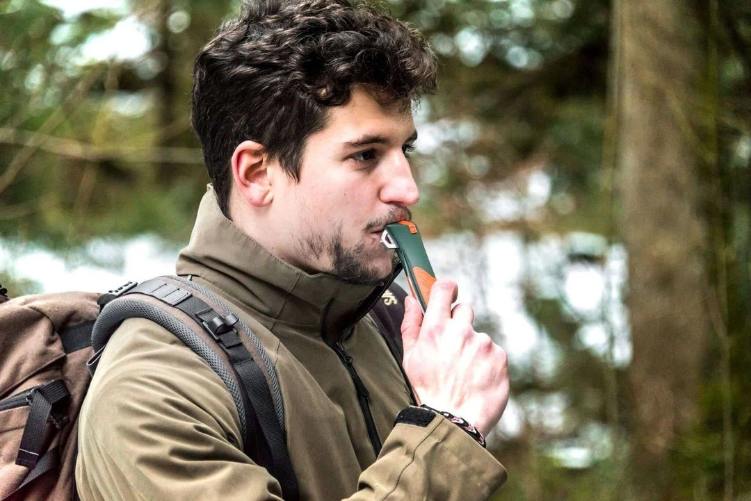 Designed for immersion activities in nature this survival knife comes with a fire starter, a gutting hook and a 110 db whistle.