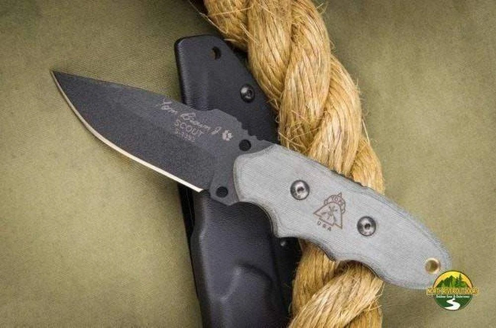 The TOPS Tom Brown Tracker Scout is a great companion knife to the Tom Brown Tracker knife. It is a small, drop point knife that is outstanding all by itself, but when paired with the Tracker, it can handle smaller, lighter tasks for which the Tracker may be too large. Make no mistake however, The Tracker Scout is a great knife for EDC work that can also be used in tactical situations. It is easily concealed and deployed, makes a great knife for the campsite, and of course, pairs perfectly with the original Tom Brown Tracker.