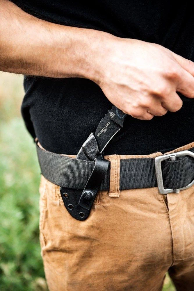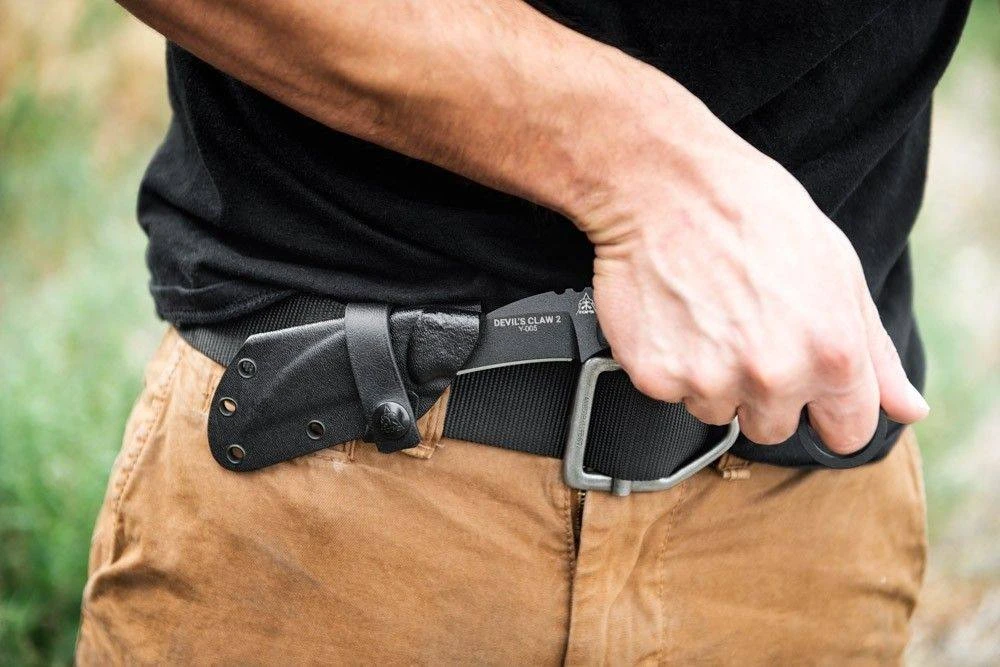 The blade shape, materials, and thicknesses are the same on the Devil’s Claw 2 as those from the original. The hawkbill blade shape is a proven design for utility and defense tactics. It bites deep on pulling cuts and on slashes. So whether you’re using it for self-defense or opening boxes, it’ll do the job quick and easy. The only real update between this and the original is that the handle has been extended to fit the user’s full hand and the ring added to the pommel as is found on karambits the world over. The longer handle with the ring on the end provides the user with options that aren’t available with the original version (just remember the trade-off is that the new version is slightly more difficult to conceal).