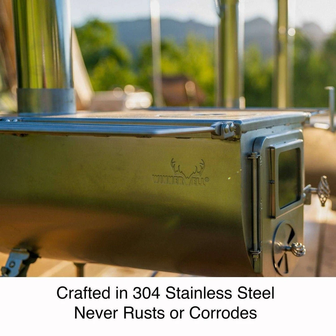 Materials: Made entirely from 304 stainless steel, using 1/8” thick material for the cooktop and 1/16” thick material for the body, Winnerwell stoves are unique in the world of portable wood burning stoves. Good quality stainless steel lends several distinct advantages: It does not rust or corrode—a huge advantage in harsh outdoor environments; It can functionally withstand higher temperatures than mild steel, allowing thinner material to be used on the stove body which significantly reduces weight, ultimately making the stove more portable; And lastly, after the first burn, the stainless steel starts to take on a very nice patina color.
